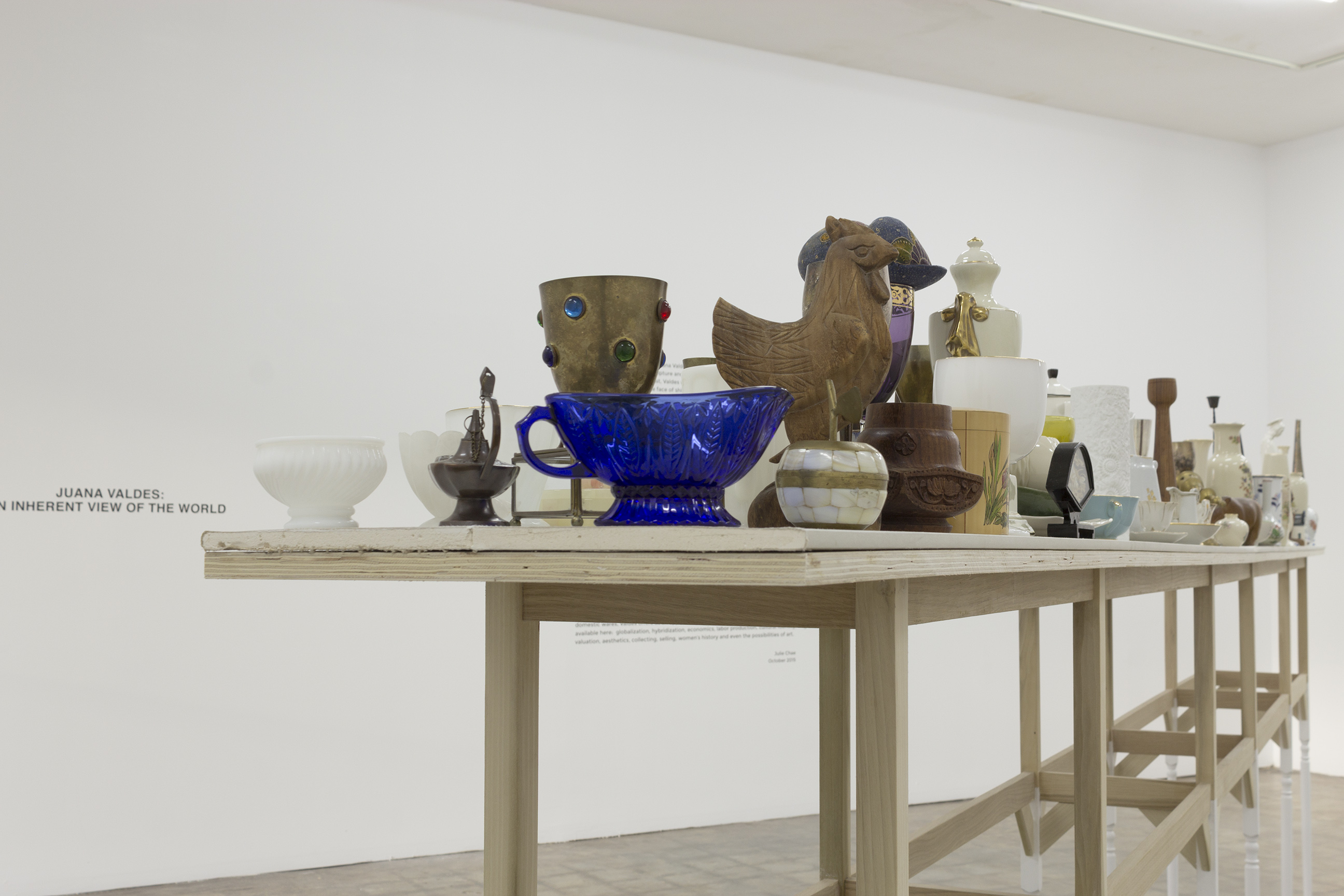 Multi-media installation artist Juana Valdes uses her training in Western post-modern philosophy, printmaking, photography, sculpture and ceramics to explore issues of transculturation, pigmentocracy, history and memory. In the past, Valdes worked with maps, ships and sailing motifs to investigate the complexities of identity in the face of shifting national/political borders as well as the history of human migration. More recently, Valdes began working with bone china porcelain, traditionally distinguished and valued for its whiteness and translucency and documented as an important commodity in the history of trade between Europe and Asia. By inserting pigments during fabrication into the clay and manipulating its chemical composition, Valdes created artworks which serve as metaphors for the mythology of whiteness in our society. In the current project on view, Valdes encourages us to ponder the history of global trade and colonialism by presenting a monumental installation of vintage china and domestic wares she has collected from antiques shops, flea markets and estate sales/auctions.