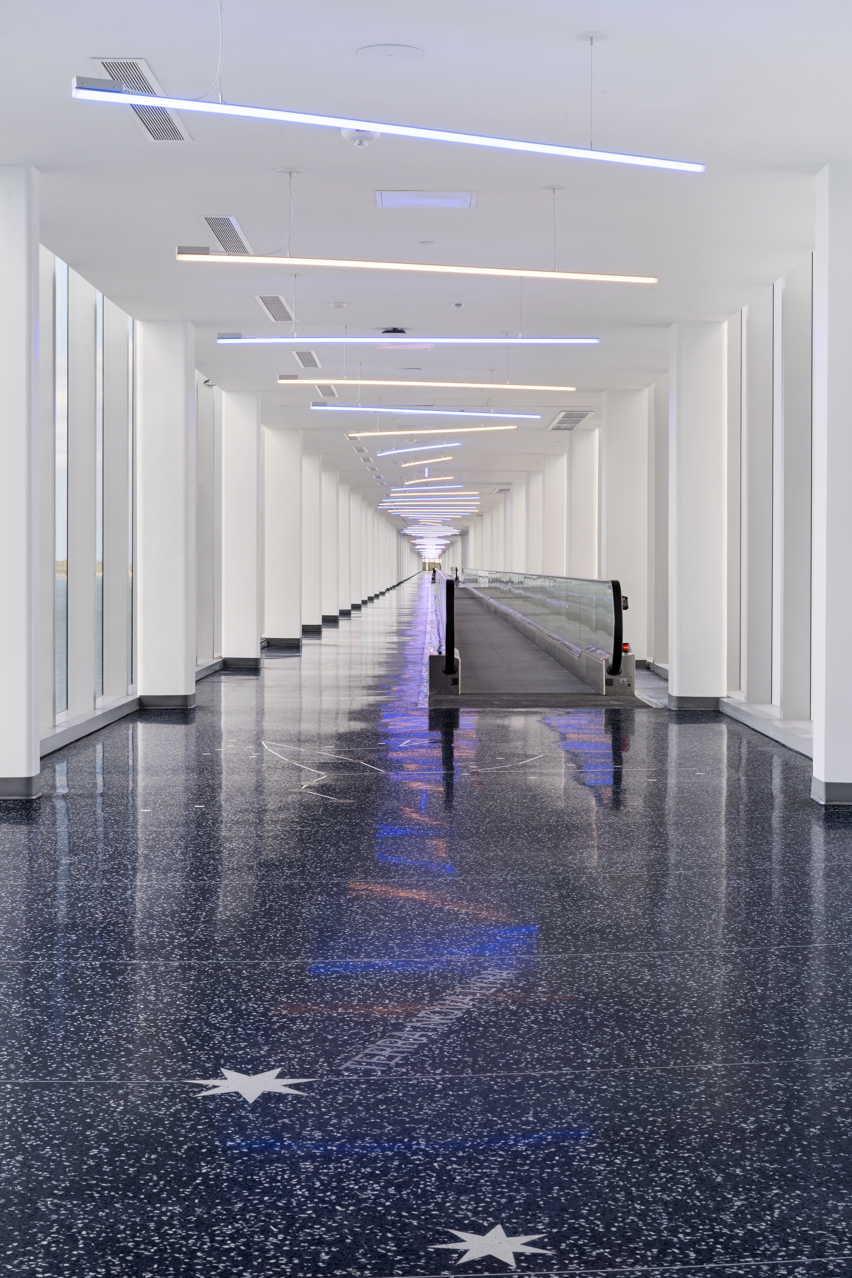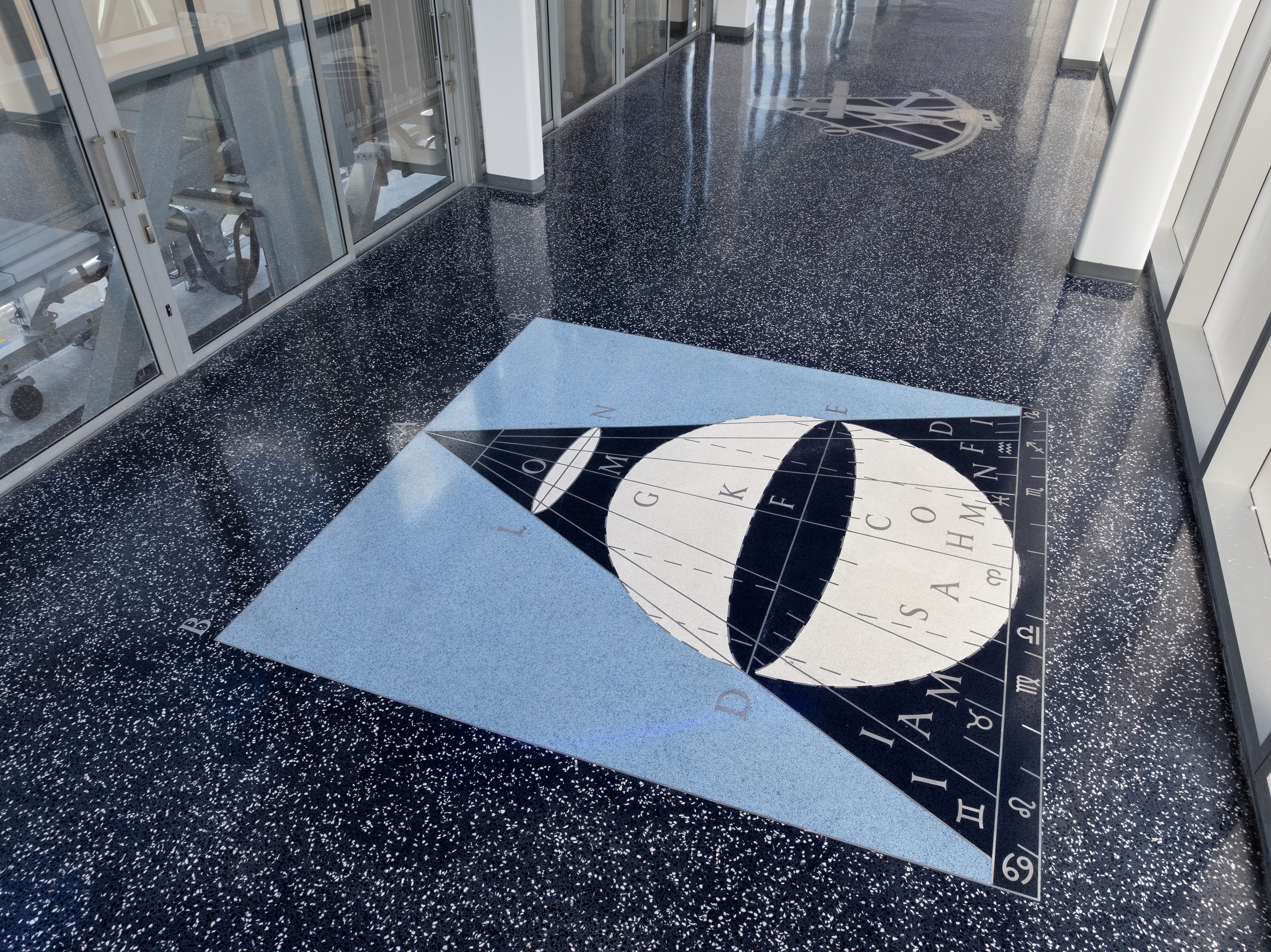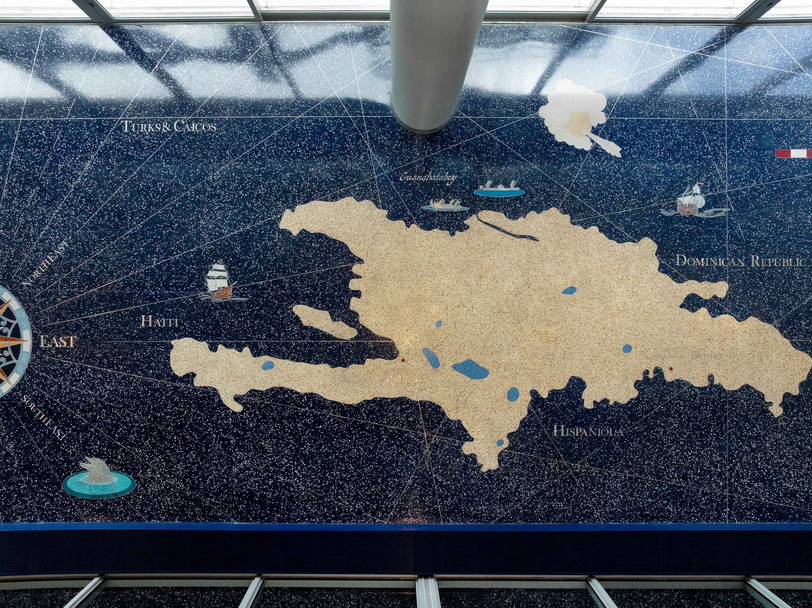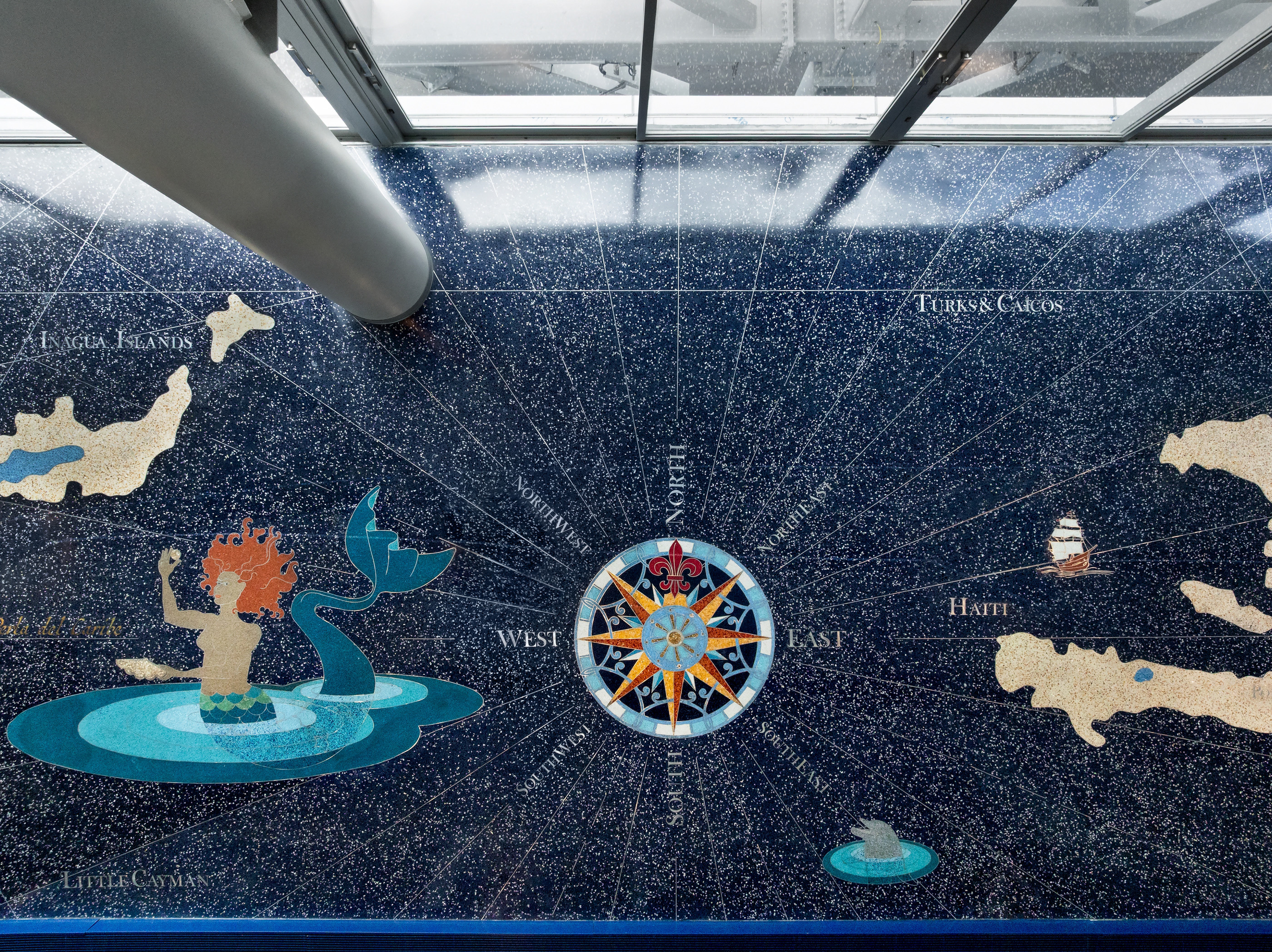 Juana Valdés’s monumental terrazzo floor fuses the history of cartography with the ingenuity of celestial wayfinding. Inspired by early migration, cartography, and maritime travel, Valdés drew inspiration from antique maps at the Hispanic Society of America, navigational diagrams, and iconography in books at the Kinney Center at the University of Massachusetts Amherst to remind us how travel has shaped our world. The cobalt blue terrazzo that spans the concourse, representing the ocean and night sky, encases the interconnectedness of the human experience as it maps lived experience on Earth to the Heavens. Valdés illustrates the evolution of navigation from the Age of Discovery to the advent of GPS today, using 274 vibrant terrazzo elements with custom inlays of aluminum, brass, marble, and lapis.