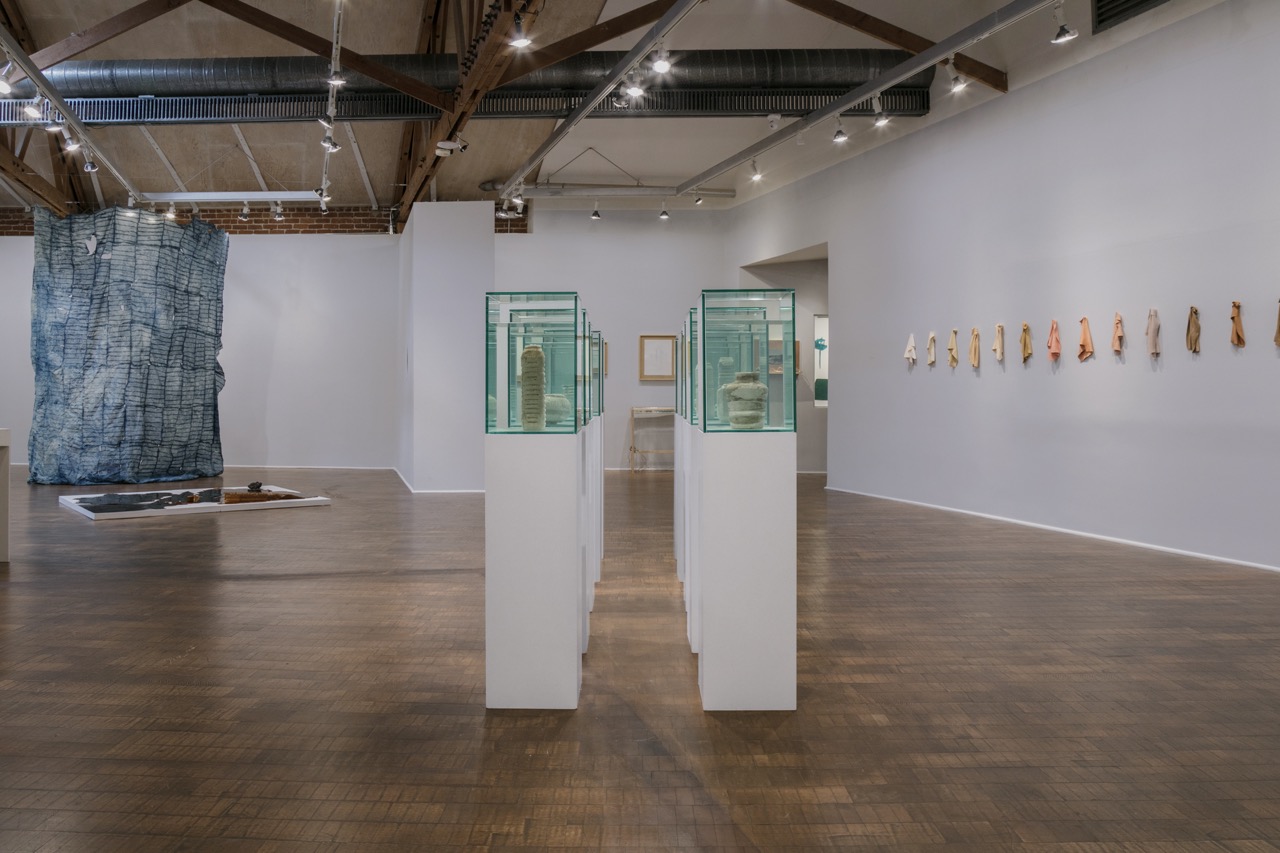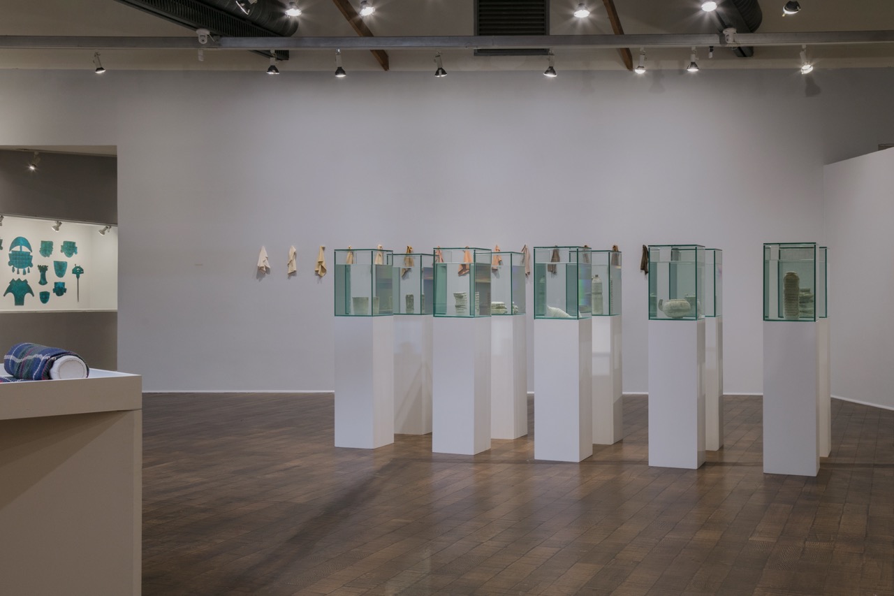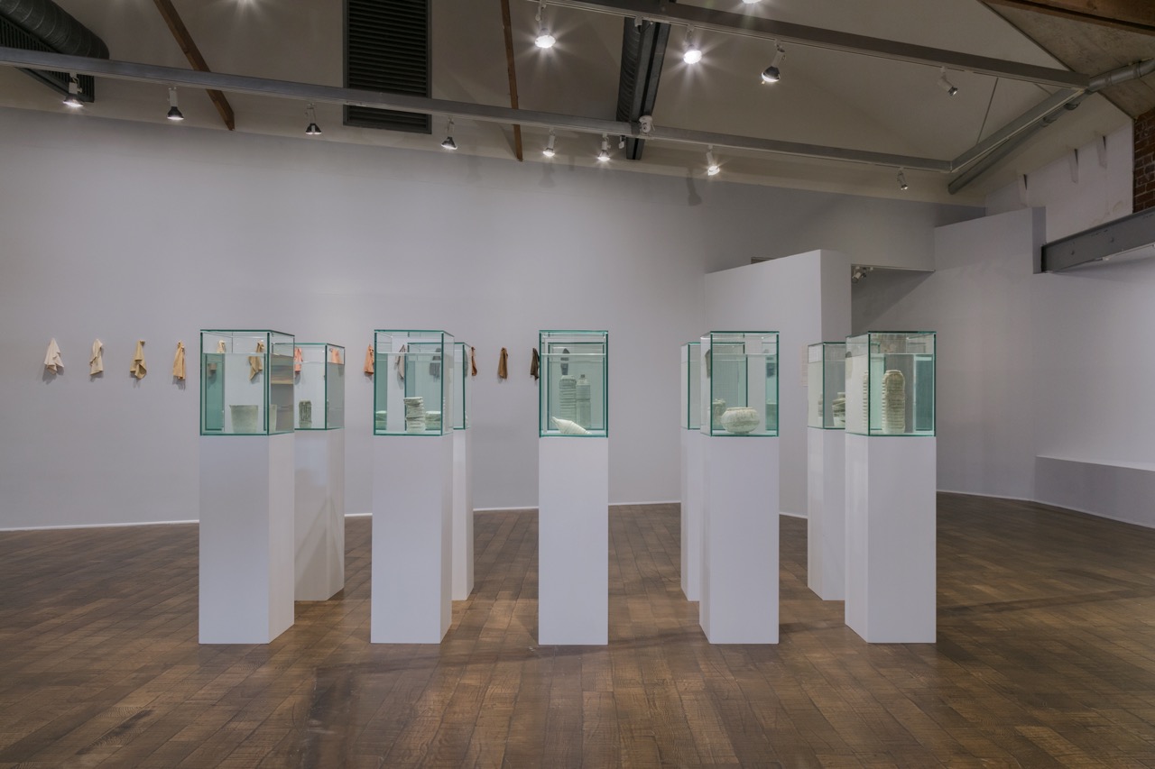 In RedBone Colored China Rags, 2012, Valdes utilizes bone china, a particular form of porcelain developed in Britain in 1794, in which bone ash was added to the clay body to better imitate the high level of whiteness and translucency found in Chinese porcelain. Valdes upends those key properties of the porcelain by adding pigment to create a range of opaque skin tones in the form of cleaning rags. Valdes subverts the traditional aesthetic expectations for bone china objects in order to recognize the domestic workers, typically women of color, who have been responsible for caring for these ceramic objects over the centuries. Valdes’s forms directly reference these women’s bodies and labor, asserting their contributions to the historical preservation of these objects. She also seeks to dismantle racialized Eurocentric standards of beauty in which whiteness is prioritized and its connection to the lasting impact of colonialization.