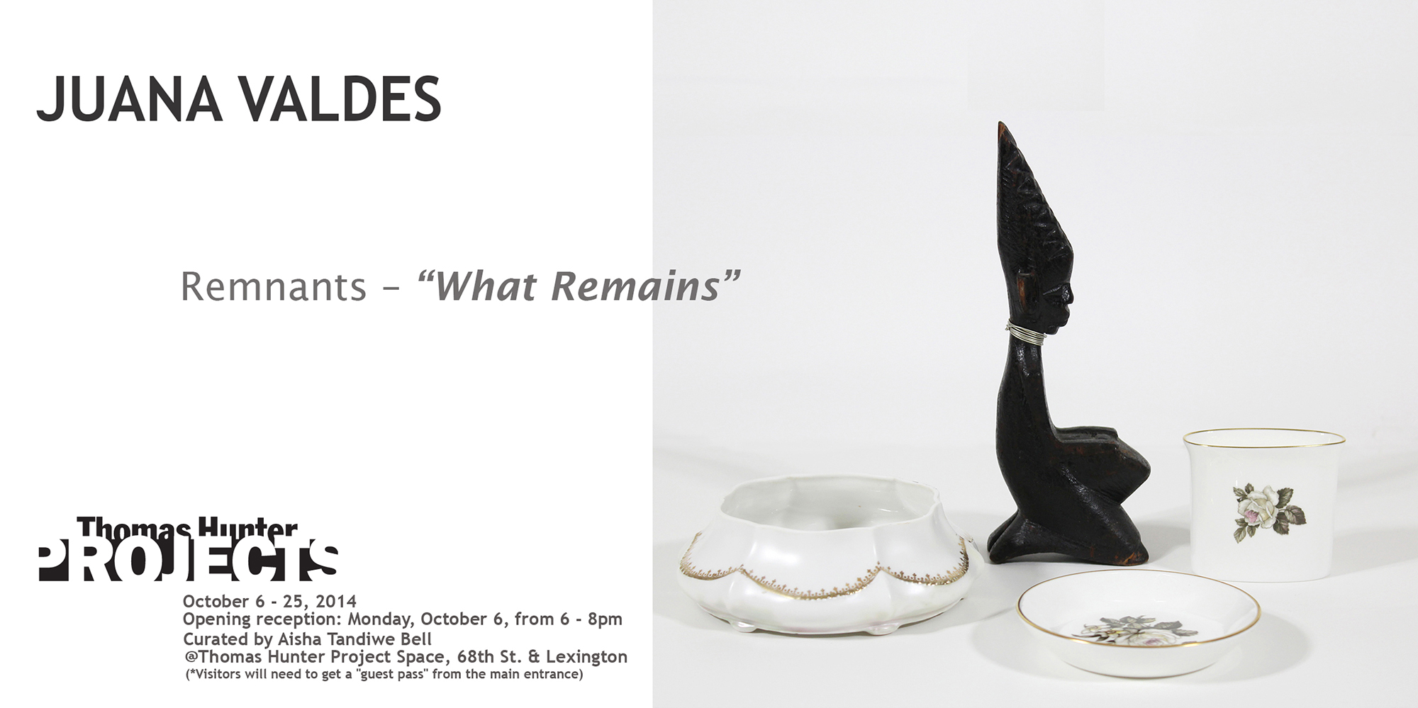 Juana Valdes’ most current work elicits migration as a complex process, constructing history through a continuum that involves both the homespace of the diasporic community and their new homeland. In Remnants –“What Remains,” curated by Aisha Tandiwe Bell at the Thomas Hunter Project Space, Juana Valdes reevaluates the worth of artistic production once considered craft-like. She uses them as a medium to identify herself and as a means to subvert the modern conception of value in visual art.