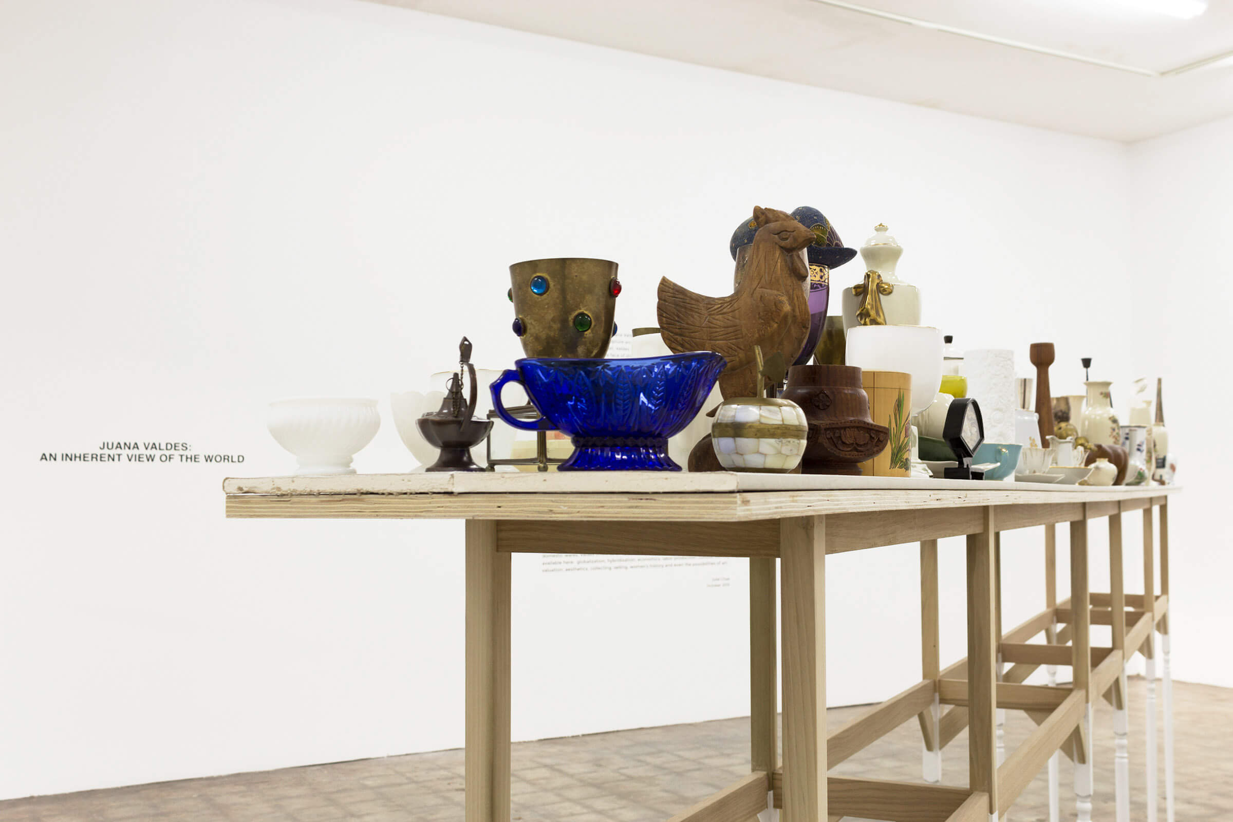 Multi-media installation artist Juana Valdes uses her training in Western post-modern philosophy, printmaking, photography, sculpture and ceramics to explore issues of transculturation, pigmentocracy, history and memory. In the past, Valdes worked with maps, ships and sailing motifs to investigate the complexities of identity in the face of shifting national/political borders as well as the history of human migration. More recently, Valdes began working with bone china porcelain, traditionally distinguished and valued for its whiteness and translucency and documented as an important commodity in the history of trade between Europe and Asia. By inserting pigments during fabrication into the clay and manipulating its chemical composition, Valdes created artworks which serve as metaphors for the mythology of whiteness in our society. In the current project on view, Valdes encourages us to ponder the history of global trade and colonialism by presenting a monumental installation of vintage china and domestic wares she has collected from antiques shops, flea markets and estate sales/auctions.